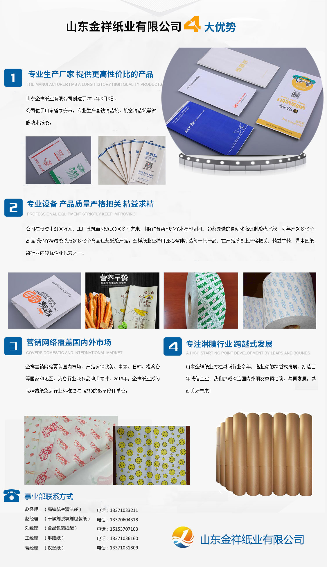山東金祥紙業(yè)有限公司創(chuàng)建于2014年8月8日,公司位于山東泰安,專業(yè)生產(chǎn)高鐵清潔袋、航空清潔袋等淋膜防水紙袋。公司注冊資本2100萬元,工廠建筑面積近10000多平方米,擁有7臺柔印環(huán)保水墨印刷機,20條先進的自動化高速制袋流水線,可年產(chǎn)50多億個高品質(zhì)環(huán)保清潔袋以及20多億個食品包裝紙袋產(chǎn)品。金祥紙業(yè)堅持用匠心精神打造每一批產(chǎn)品,在產(chǎn)品質(zhì)量上嚴(yán)格把關(guān),精益求精,是中國紙袋行業(yè)內(nèi)較優(yōu)企業(yè)代表之一。金祥營銷網(wǎng)絡(luò)覆蓋國內(nèi)市場,產(chǎn)品遠(yuǎn)銷歐美、中東、日韓、港澳臺等國家和地區(qū),為各行業(yè)眾多品牌所青睞。2019年,金祥紙業(yè)成為《清潔紙袋》行業(yè)標(biāo)準(zhǔn)QB/T 4379的起草修訂單位。